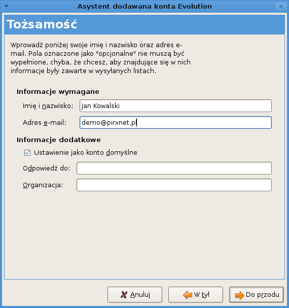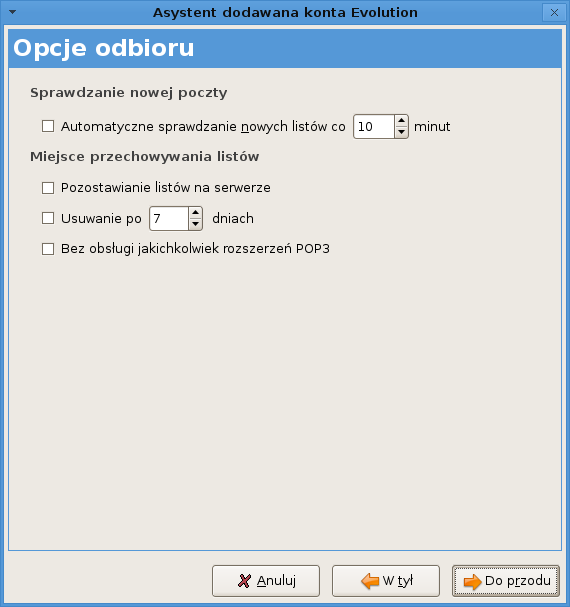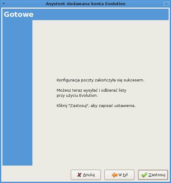 Zaczynamy od uruchomienia Evolution. Po uruchomieniu powinien nam się ukazać następujący kreator:
