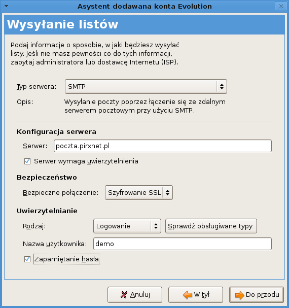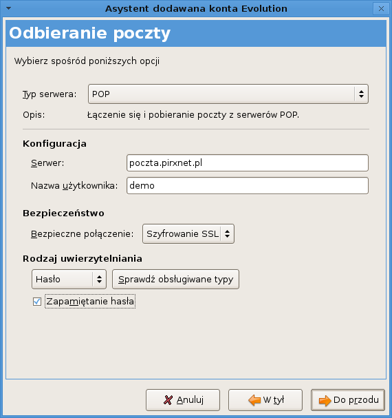 Z listy rozwijanej wybieramy POP, wpisujemy adres serwera poczta.pirxnet.pl, wybieramy bezpieczne połączenie przy użyciu Szyfrowania SSL oraz w razie potrzeby zaznaczamy Zapamiętywanie hasła.