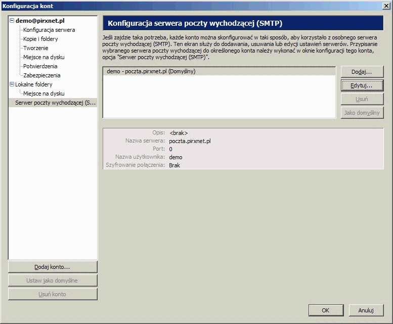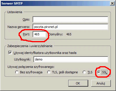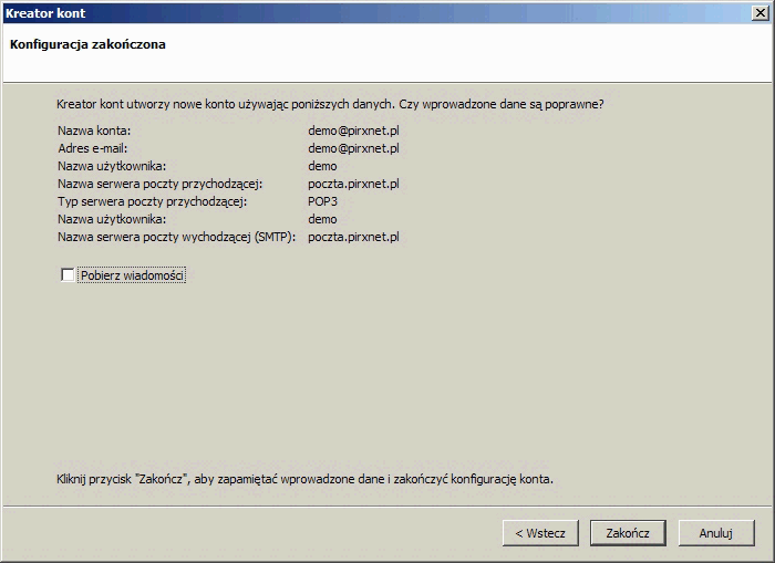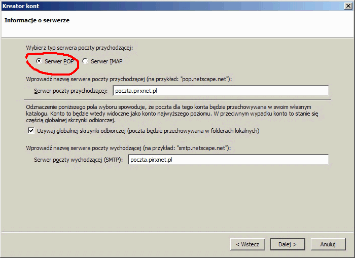 Zarówno dla serwera poczty poczty przychodzącej jak i wychodzącej wpisujemy