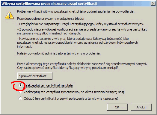 "Zaakceptuj ten certyfikat na stałe"